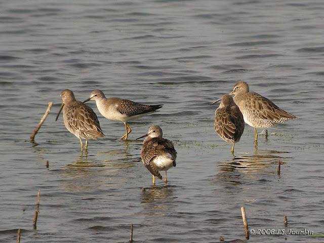 From the east dike I saw 4 Stilt Sandpipers in basic plumage. Another 6 juvenile Short-billed Dowitchers feed closer in, along with a pair of basic plumaged Dunlin, and another White-rumped Sandpiper. Farther inland another Ruddy Turnstone was seen.
