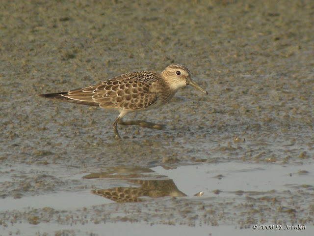 Closer to the near bank a juvenile Baird's Sandpiper fed alongside several Semipalmated Sandpipers.