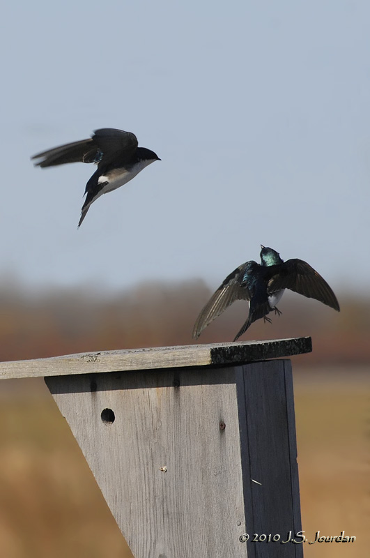 At one point we stopped for a few minutes to get out of the van. I walked over to a small stand of trees and found a half-dozen Brewer’s Blackbirds. Unable to get a clean photo through the trees, I walked to a nearby bluebird box and found several Tree Swallows fighting to stay out of the wind. One bird perched at the opening, and I’m guessing it was there strictly to avoid the wind. Another pair of birds flattened themselves atop the roof of the box so that the wind would blow over them.