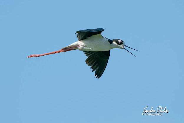 Black-necked Stilt (Himantopus mexicanus) 2 Possibly nesting in NE corner of Humphries next to Middle Causeway. One bird flying and calling "Bet-Bet-Bet" while other was bathing next to causeway. Tall apindly shorebirds black and white w/ pink legs. PHotos.