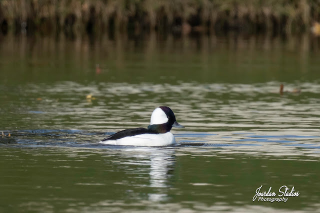 As I drove by the ponds in front of Bridgewater here in Brownstown I spotted a male Bufflehead swimming alongside the several dozen Canada Geese. I decided to grab the scope and camera and get a few pics.