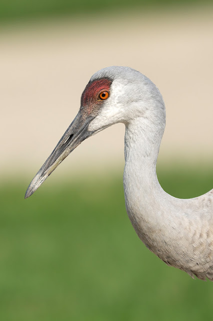 Today a new Michigan Law takes affect that prohibits the use of a cellular phone while operating a motorized vehicle. So, here I am, heading out of the driveway to pick up some bird seed when I spot a Sandhill Crane at the house of Mark and Diane Hepner five doors down the street! The bird was just chilling on the grass in front of their house, so I stopped and grabbed the phone to get a few pics. It was then I realized I'd just broke the law...