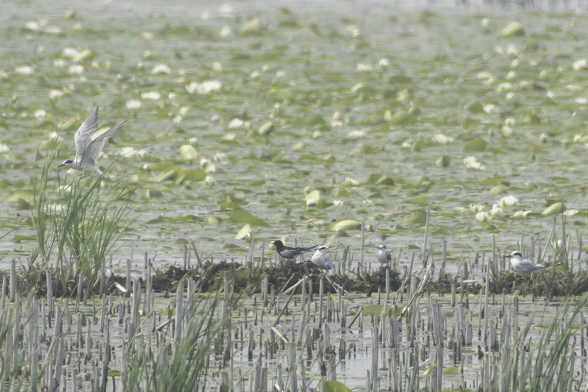 Better than a quarter-mile away the White-winged Tern was only visible through the scope. As I digiscoped it with the Sony a1 + 40/2.5 + Digidapter™ I could see the light gray wing patch diagnostic of the bird. It was associating with a flock of more than ten Black Terns (adults and juveniles) and several Forster's Terns on a strip of mud in the middle of the Unit. Nearby muskrat dens and small pockets of open water provided perching and foraging locations. Distance, haze, and mid-afternoon glare made for problematic imaging, but a good tripod and a steady hand helped record sufficient information to verify ID. Best photos came from the Sony a1+600/4+1.4TC+1.5 crop mode on the tripod.