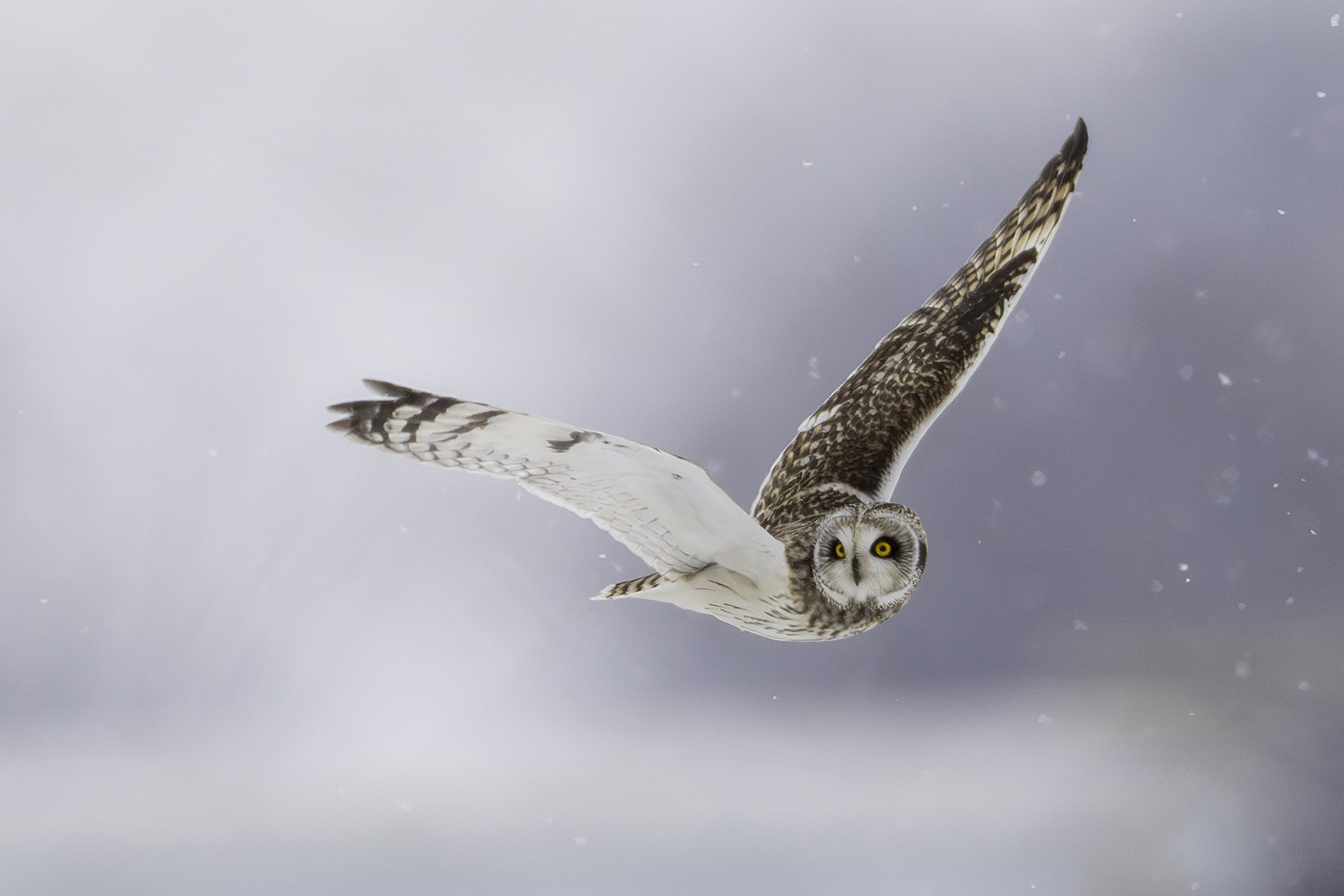 After 20 minutes or so things quieted down and I was ready to move on. I slowed to a stop when I spotted one owl perched about 30 yds east of the other photographers. They were a good distance from the bird so I waited until it took off before driving by.