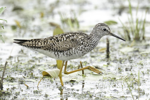 At Cell 3 I had to bushwack through the Giant Parsley to get a view of the open water and mudflats. When I did was surprised to see a couple dozen small 'peeps' foraging along the water's edge. Several more Lesser Yellowlegs and a Short-billed Dowitcher seemed to confirm that Fall Shorebird Migration has already begun (I normally use July 4th as the start of the migration).