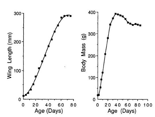 Growth pattern similar for five races (alba, pratincola, affinis, javanica, and stertans). See Figure 3. Crawls feebly by 1st day, holds head up strongly by 12th day, walks well by 14th day, can swallow whole mice by 16th day, stretch and flaps wings by 30th day, first flight at about day 55, independent of adults by 76-86th day. Stands upright by 15th day when female is absent but still sleeps lying down until about 45th day; rolls onto back in defense and gradually begins to strike defensively with claws as age increases. See Bunn et al. (Bunn et al. 1982) for detailed discussion. Members of brood sleep huddled together; little strife among nestlings--some squabbling over food. Older nestlings may feed younger nest mates (Epple 1979, Bunn et al. 1982, Marti 1989). See the Cornell Lab of Ornithology's Nest Box Cams for details.