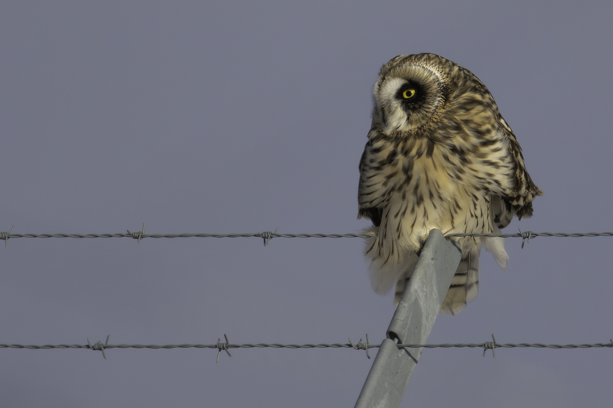 Short-eared Owl (Asio flammeus) 1 Sitting on fence next to antenna farm. Pics. Someone mentioned that 2 more birds were seen just before I arrived.